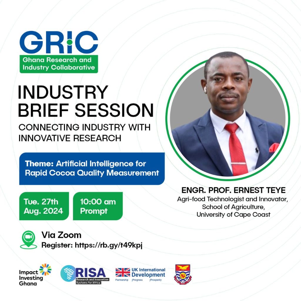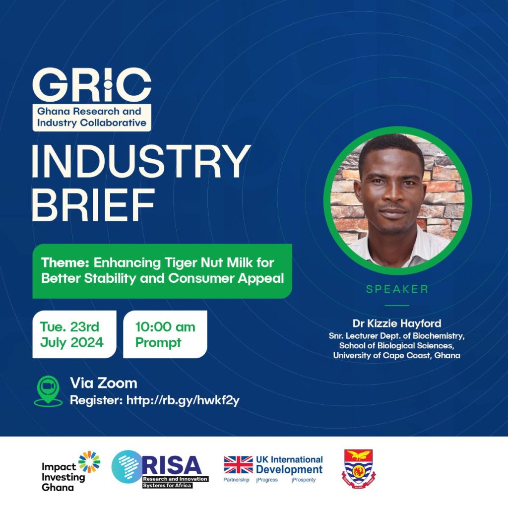 Join the next Ghana Research Industry Collaborative (GRIC) Industry Brief Session, where we’ll explore innovative solutions bridging research and industry to enhance product development and commercialisation in Ghana’s food and beverage sector.